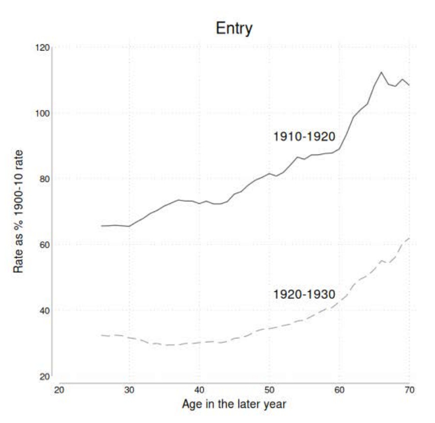 This is a more complex exercise than just looking at how the average age of teamsters changed, which might be your first instinct. But it’s necessary – if teamster employment fell uniformly, and the remaining teamsters got older, then the average age would go up mechanically without any relationship to obsolescence rents. Thus, the need to compare entry rates to the past within each age group.