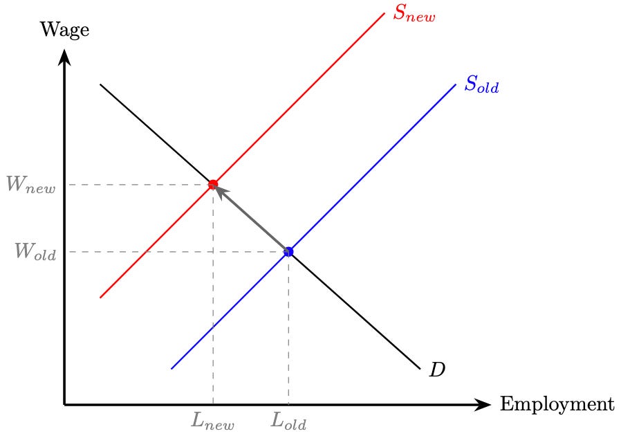 This risk of future job loss shows up as a leftward shift in the labor supply curve – at any particular wage, workers are less willing to work in the job than they were before: