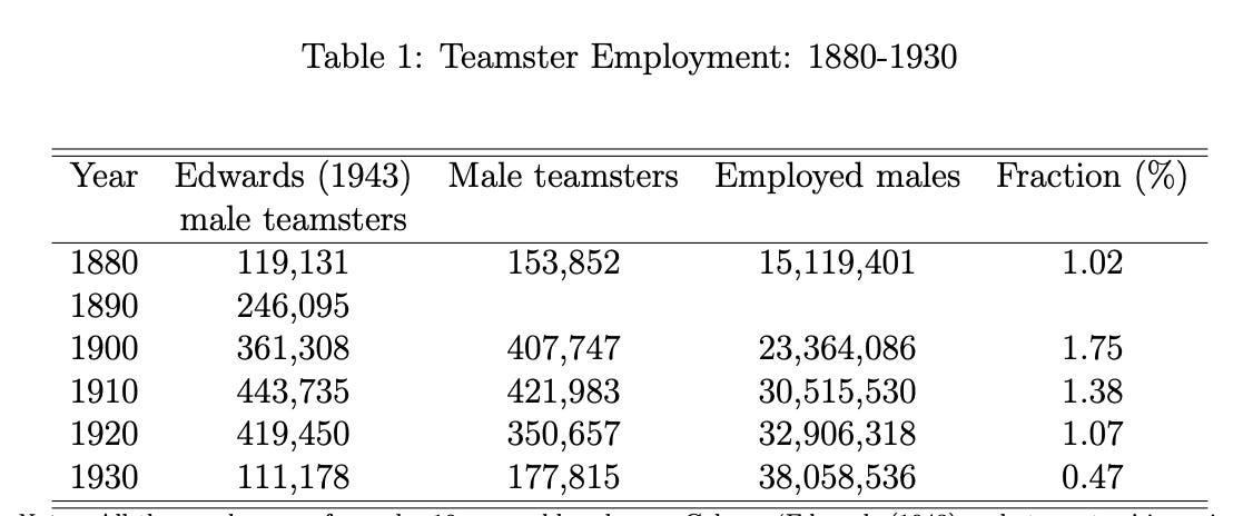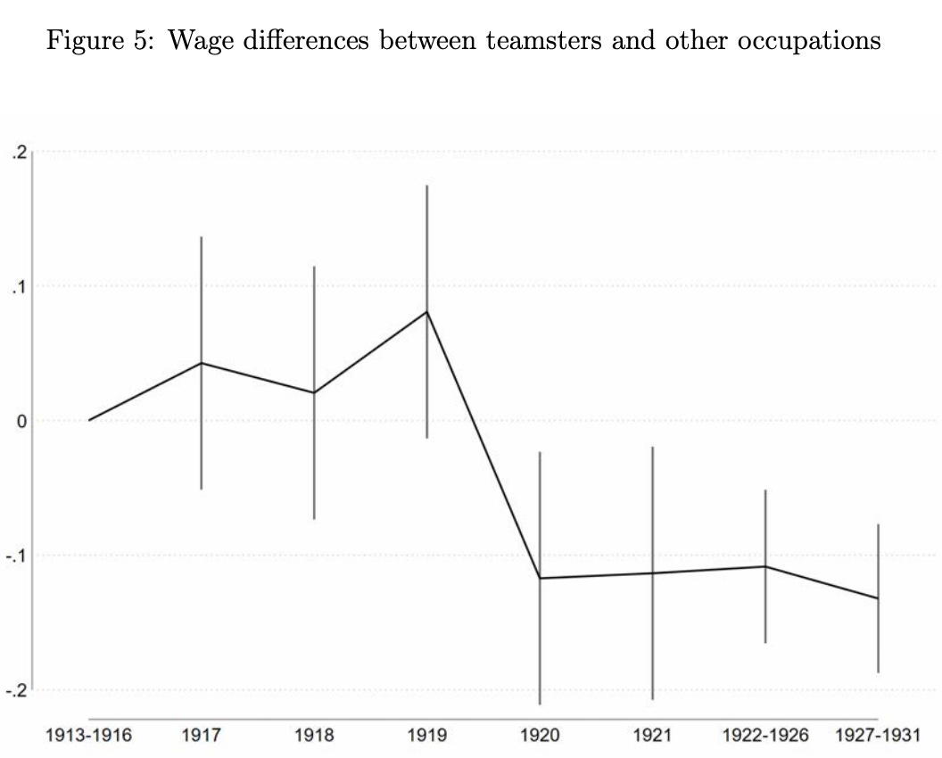 First, did teamsters see falling employment before trucks were actually deployed? Yes. The researchers used Census data to track how many people worked as teamsters in 1900, 1910, 1920, and 1930. Teamster employment rose from 1900 to 1910, when motor trucks were still a distant prospect. But it fell slightly from 1910 to 1920, even though trucks weren’t yet widespread. This is the sign of obsolescence rents: teamster employment dropped before trucks were actually deployed. Of course, employment absolutely cratered between 1920 and 1930 as trucks took to the road, but that is the part that we expected already.